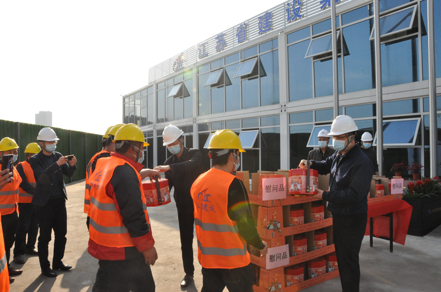 在新春佳节即将到来之际,2021年2月7日下午,中江国际集团公司党委书记、董事长宋勤波、总经理朱新宝、党委副书记、工会联合会主席孙光能、副总经理屠亚星一行来到南部新城A地块一标段项目施工现场,亲切慰问春节期间依然驻扎在项目一线、坚守岗位的员工,同时检查项目质量、安全工作。集团公司总经理助理、生产经营部部长唐来顺、党群工作部部长王继胜、质量安全部部长梁宸,建设集团党委书记、董事长张永清、总经理陪同慰问。
