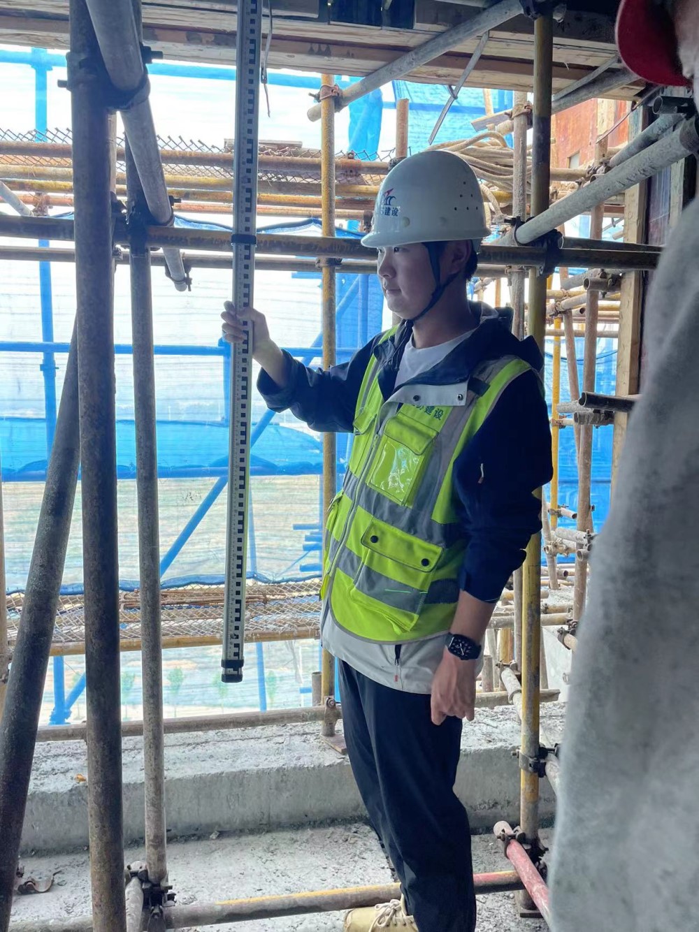谢振涵(23岁,2022届大学生):塘坊二期C地块施工员,虽然是团队中年龄最小的一员,但工作一点都不马虎,认真向前辈学习,努力让自己成长为一名优秀的工程人。