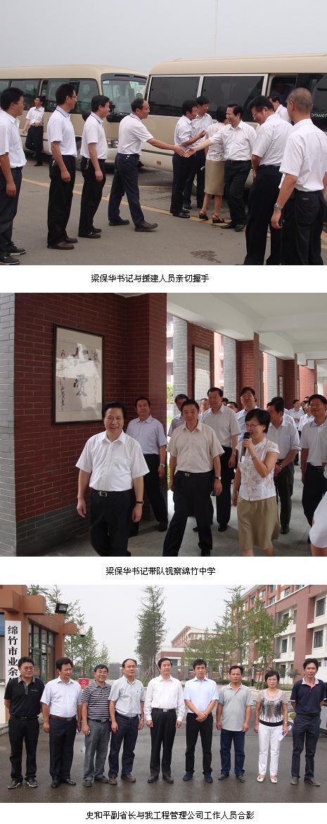 梁书记、罗省长一行在参观新建的绵竹中学时,对学校的建设速度、水平和质量给予了充分肯定,并与老师学生们进行了交流,向学校赠送图书10000册,勉励老师们认真工作、教书育人,勉励同学们刻苦学习、报效祖国。