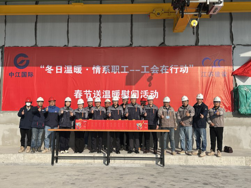 春节即将来临之际,中江国际集团联合省部属企事业工会开展“春节送温暖”慰问活动。1月13日下午,中江国际集团党委副书记孙光能、省部属企事业工会四级调研员梁观山一行来到建设集团上海科思创项目部,听取科思创项目建设情况汇报,对建设集团华东事业部发挥基层党组织战斗堡垒作用、加强科学管理、落实安全生产责任给予充分肯定。