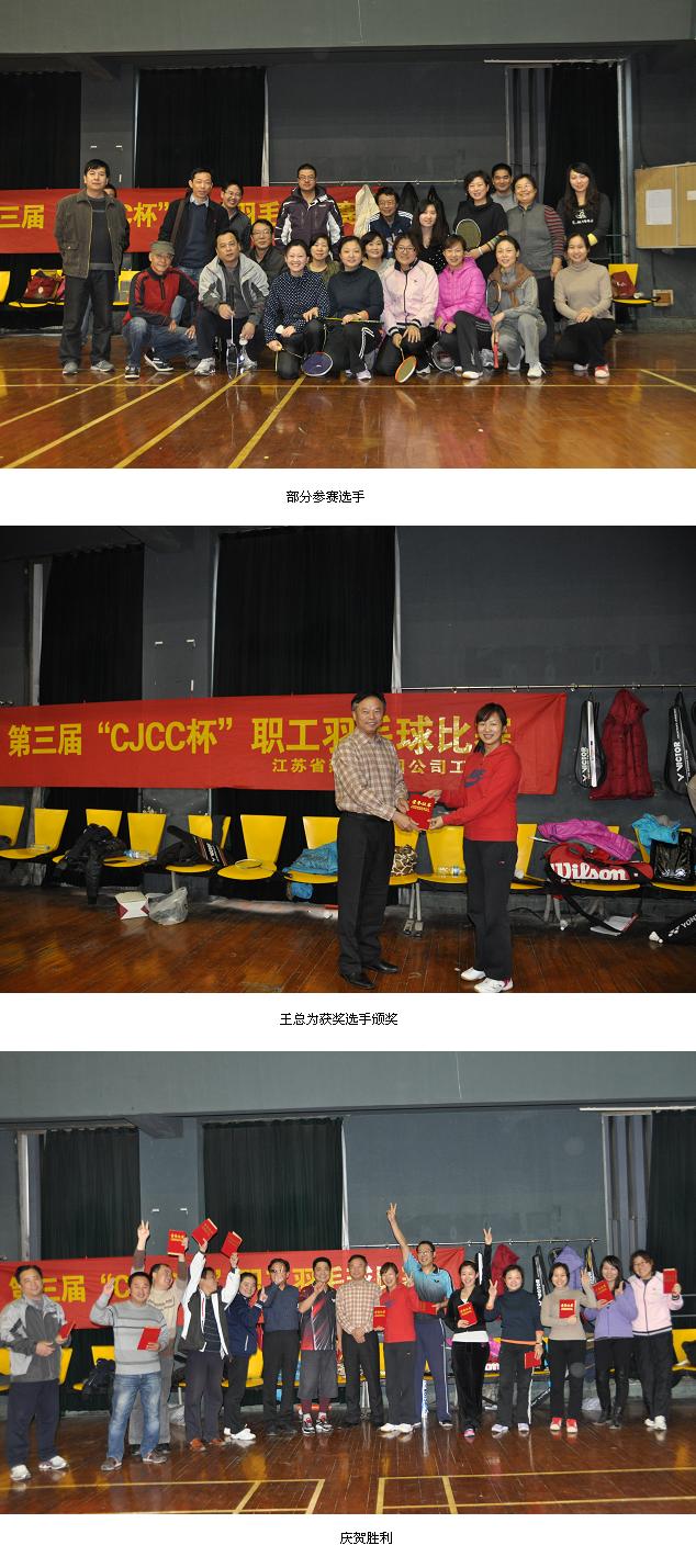 2012年11月30日,在公司党委的大力支持下,由工会组办的省建设集团第三届“CJCC杯”职工羽毛球比赛在南京五台山明发羽毛球馆举行。本次大赛参与度较高,来自分、子公司和总部的报名参赛员工逾50名。公司党委书记、总经理王云亲临赛场为获胜者颁奖,党委副书记、工会主席施松峰到场为大家加油鼓劲,副总经理夏晓东、工会副主席张冀明在赛场上与大家共同切磋球技。
