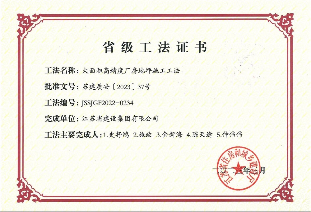 大面积高精度厂房地坪施工工法——省级工法证书