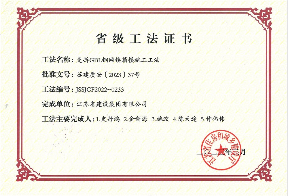 免拆GBL钢网镂箱模施工工法——省级工法证书