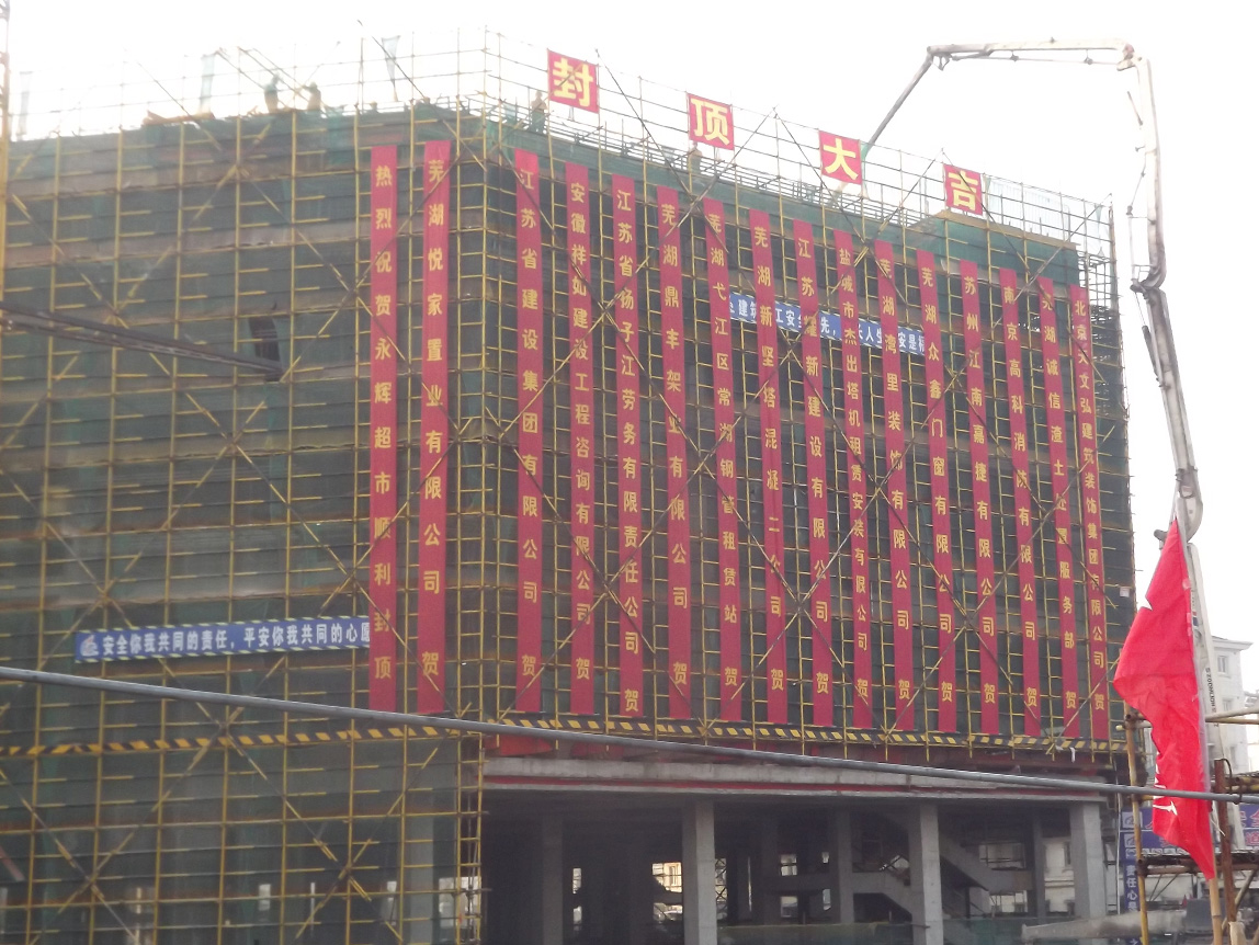 芜湖悦达广场项目总建筑面积超过13万平方米,包括高层住宅楼、商业综合楼、综合楼等九个单体工程。自江苏分公司承接该项目以来,在工期紧、难度大的诸多不利条件下,强化施工组织管理,紧抓安全生产不放松,确保了本次综合1#楼的顺利封顶。该项目建成后,将成为芜湖市标志性的城市商住综合体。