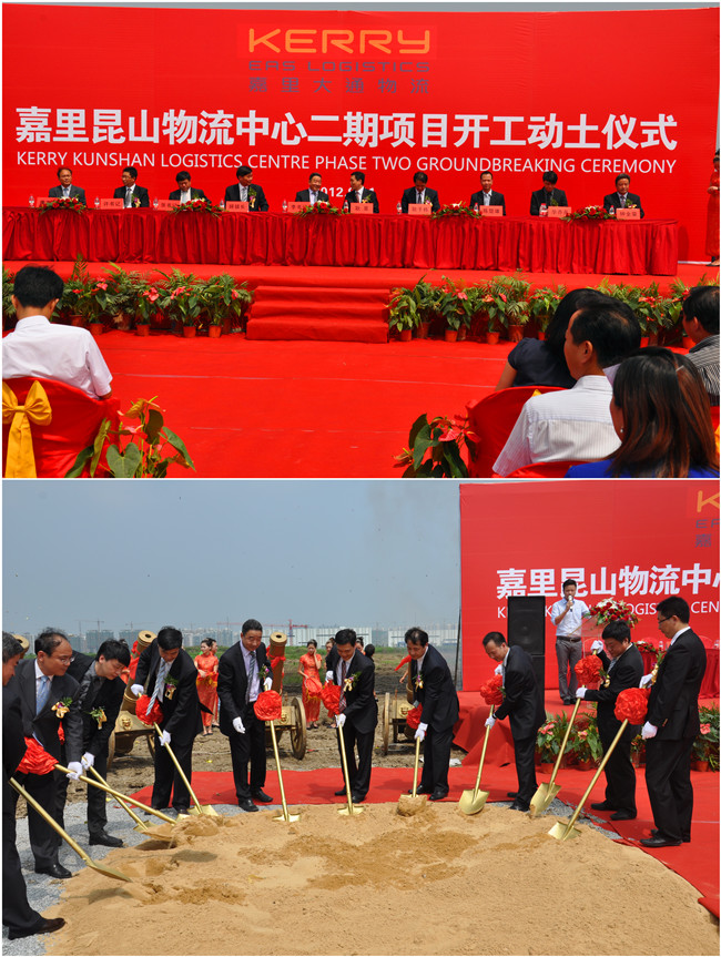 2012年9月11日上午,嘉里物流(中国)有限公司昆山物流中心二期项目在昆山千灯沿沪产业带物流园举行了盛大的开工动土仪式。香港嘉里物流公司董事兼东区总经理耿昊、东区副总经理耿子栋、嘉里物流(昆山)有限公司总经理华亦兵、千灯镇党委书记李文、镇长顾菊明、中国电子第十一设计研究院院长钟全荣等相关部门领导出席了开工动土庆典。江苏省建设集团公司副总经理唐来顺应邀出席开工庆典。