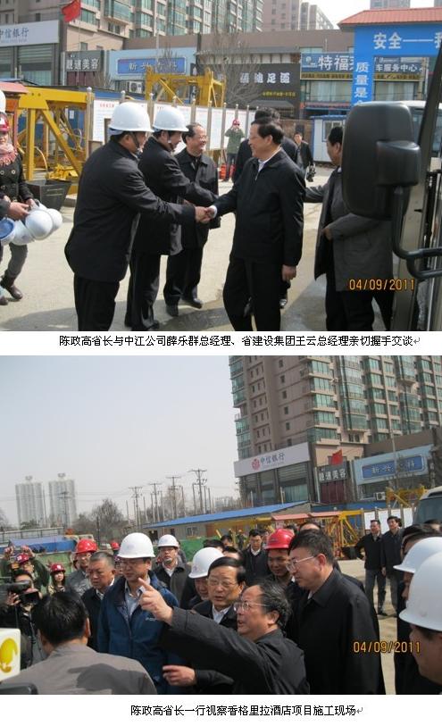 2011年4月9日,辽宁省省长陈政高在沈阳市陈海波市长的陪同下,实地考察了我司承建的沈阳香格里拉酒店项目。在工程施工现场,陈政高省长与中江公司总经理薛乐群、省建设集团公司总经理王云、沈阳香格里拉酒店项目经理肖军等同志亲切交谈。陈省长要求我司进一步加大组织协调力度,以确保安全、质量为前提,努力加快施工进度,确保项目如期竣工运营。