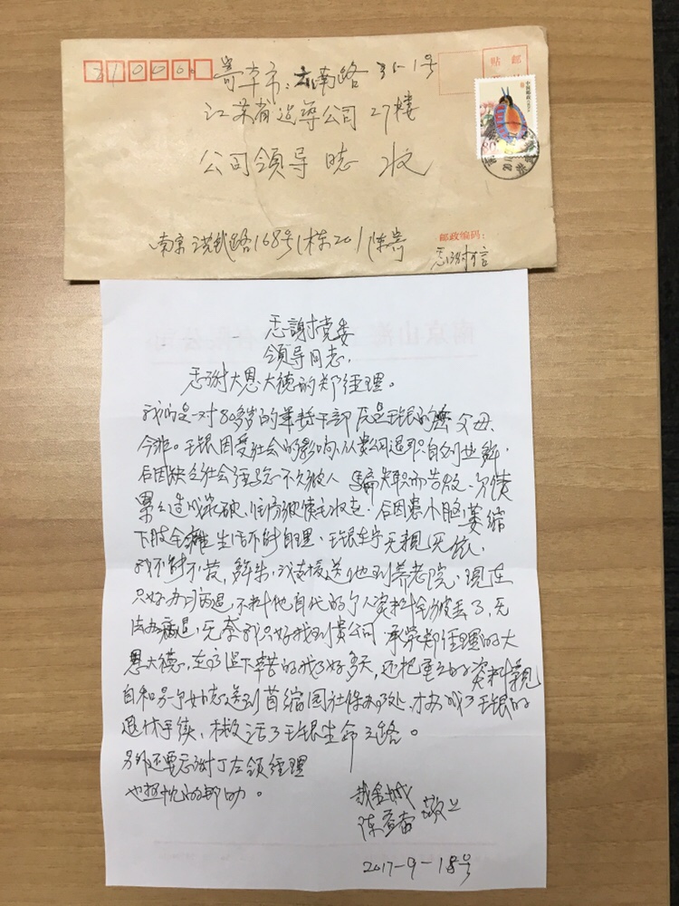 近日,建设集团收到一封来自八旬老人的感谢信。信中对公司人力资源部负责人郑昕、江苏分公司总经理丁佐领的热忱帮助表示了由衷感谢。今年八月两位老人在炎炎烈日下来到公司,通过丁佐领同志的帮助,为现在已无亲属关系但身患重病的前建设集团辞职人员寻找人事档案,拟为其办理提前病退手续。该同志的个人档案在其辞职后被遗失,所有档案资料均无法提供,社保机构要求所在单位提供该同志在职时的原始证明材料。