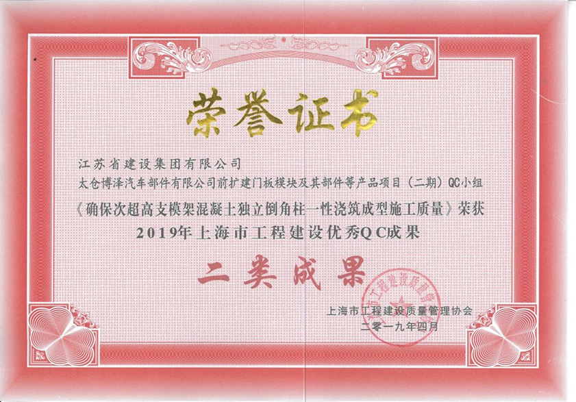 太仓博泽项目获得2019上海市QC二类成果奖