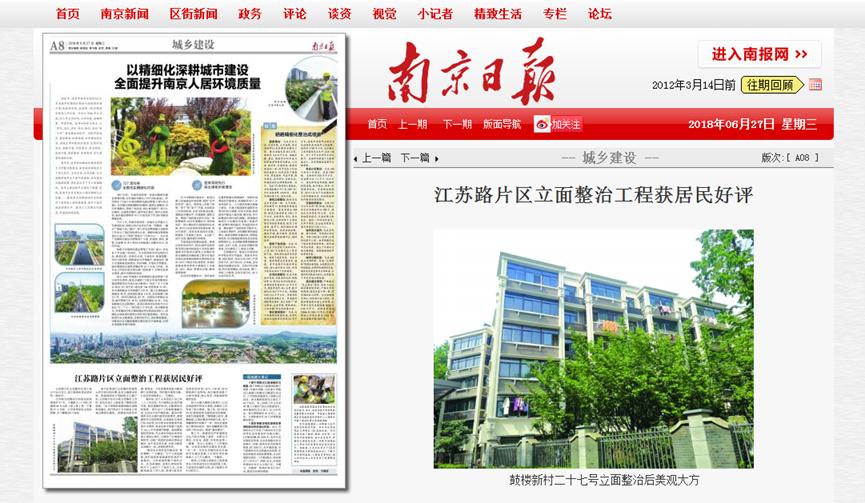 江苏省建设集团有限公司(中江一建)积极参与南京立面整治工程,在江苏路片区道路沿线立面整治工程和虎踞里房屋整治出新工程建设中广受好评。
