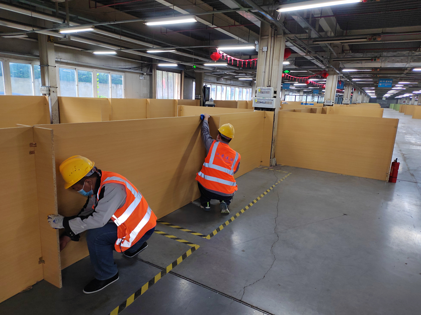 为尽快阻断疫情传播,4月17日,上海宝山城市工业园区管委会下达了辖区内建立方舱医院的紧急通知。在接到属地政府协助建舱的指令后,华东事业部党支部第一时间做出部署,紧急成立任务工作组,迅速集结在园区内的公司索灵项目部,派出一支具有丰富施工经验的志愿队支援建舱。虽然建设任务具有一定的被感染风险,但是没有一个人愿意退缩,在经过连续14个小时的奋战后,援建队伍出色地完成了宝山方舱医院内的隔断建设任务。此处方舱医院的建成,能够容纳近1500人隔离需求,为新冠肺炎病例的早发现、早隔离、早治疗争取了时间和空间。