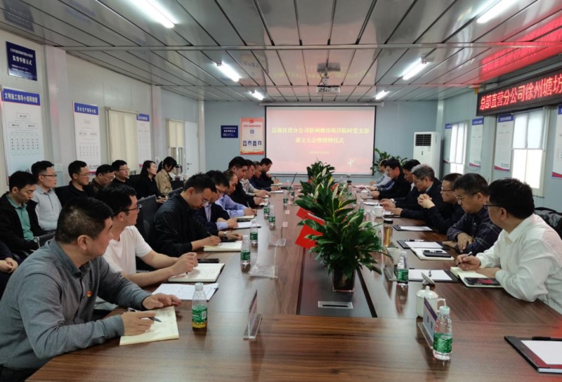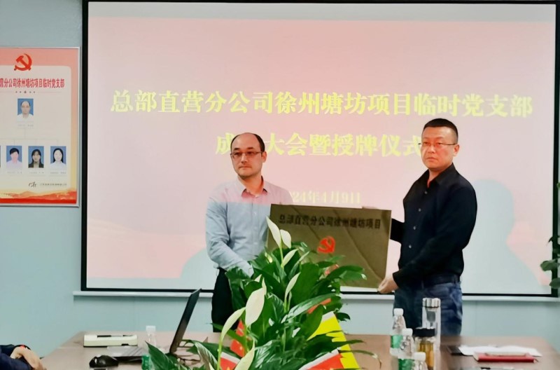 会上,公司党办宣读了党委关于成立江苏省建设集团有限公司总部直营分公司徐州塘坊项目临时党支部的文件,公司副总经理严勃向临时党支部授牌。