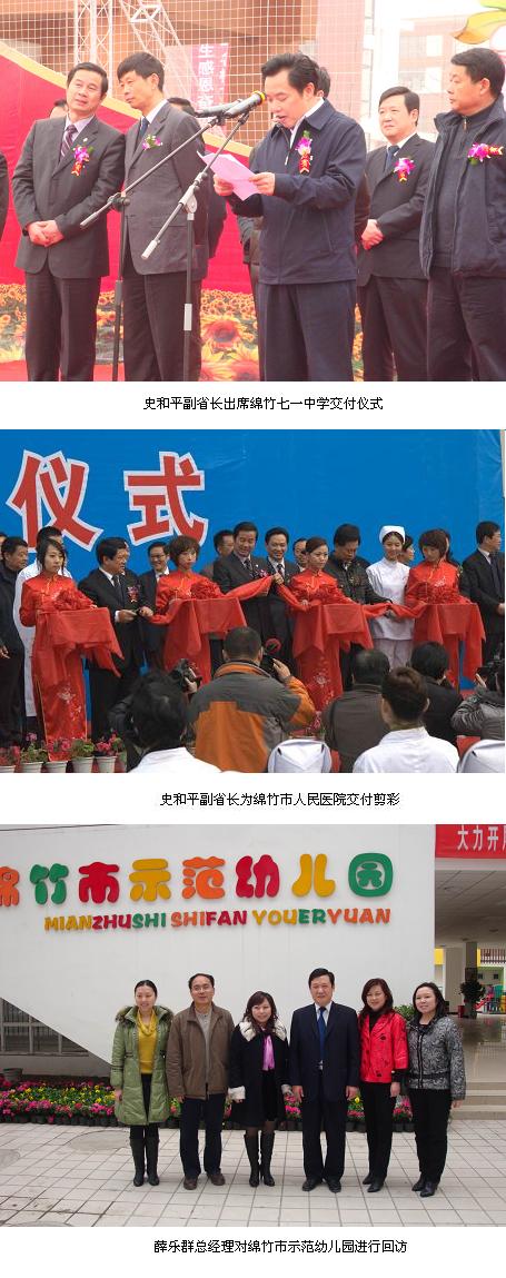 2月26-27日,江苏省政府史和平副省长率省政府代表团赴四川绵竹检查指导工作,并出席了上述两项工程的交付仪式,对工程的施工质量和进度表示满意,对省建设集团的工作予以了充分肯定,并勉励大家再接再厉,善始善终地全面完成好援建任务。中江公司薛乐群总经理随团参加了交付仪式,并在工程管理公司唐来顺总经理的陪同下,赴去年已交付使用的绵竹市第一、第二示范幼儿园进行回访。薛总对省建设集团的援川代建工作予以了充分肯定,在省建设集团全体援建工作人员会议上,要求大家继续努力,按照省援建指挥部的工作部署,确保按时保质全面完成援建任务,不辱使命,为建设集团争光,为中江公司树立良好社会形象再立新功。